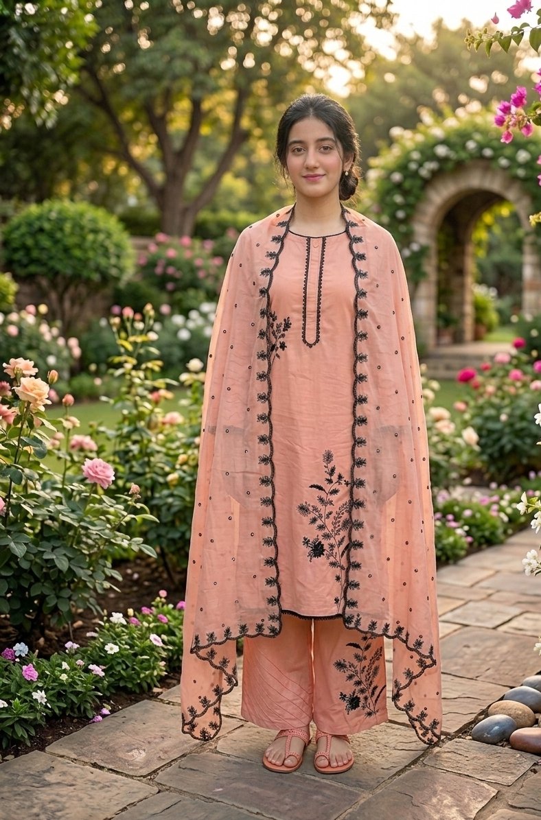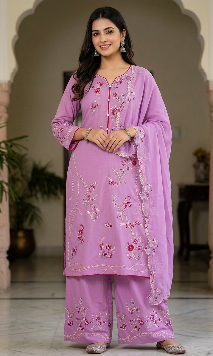 Lilin 3-Piece Suit with Embroidered Neckline, Sleeves & Daman Patches
