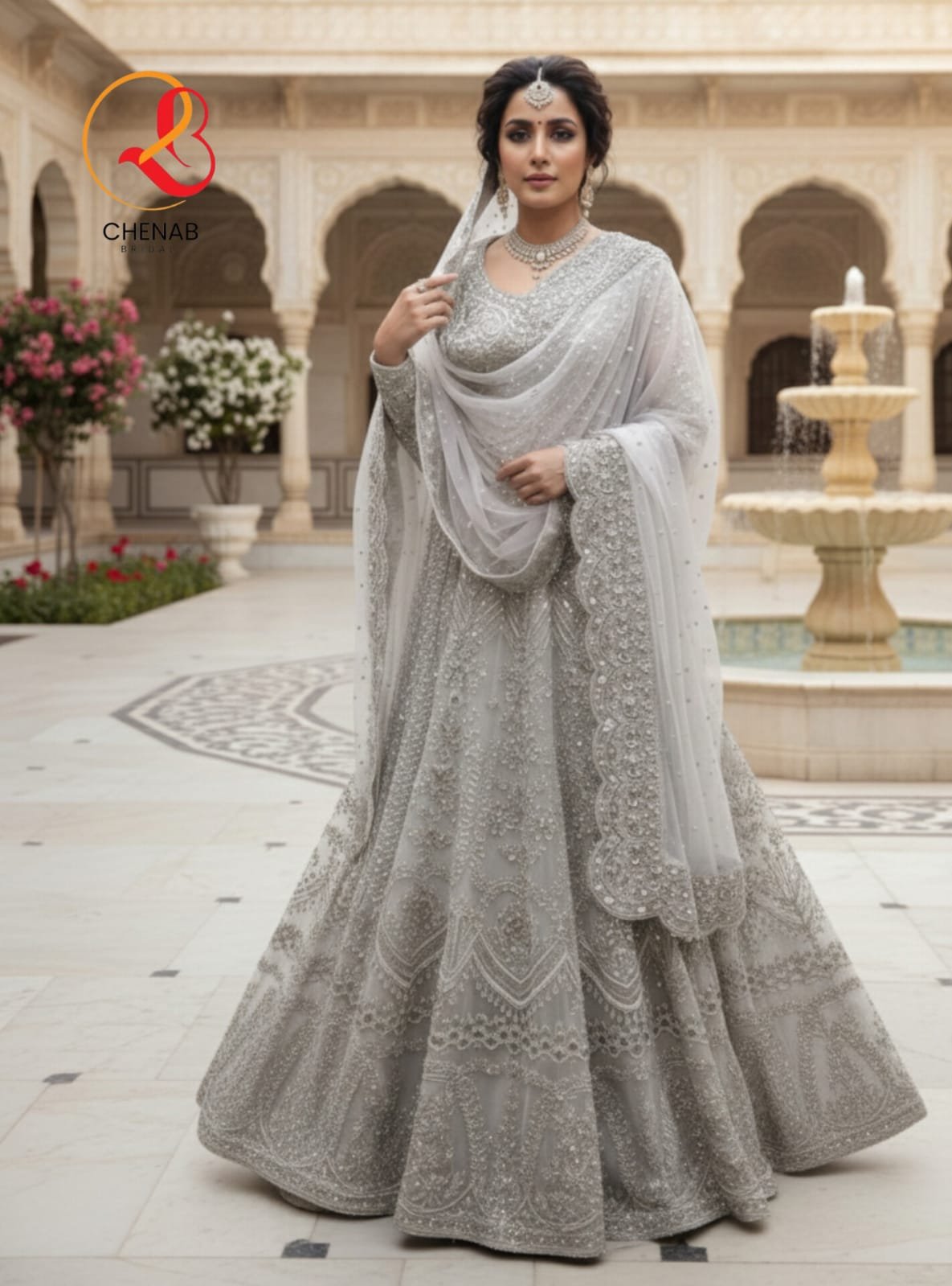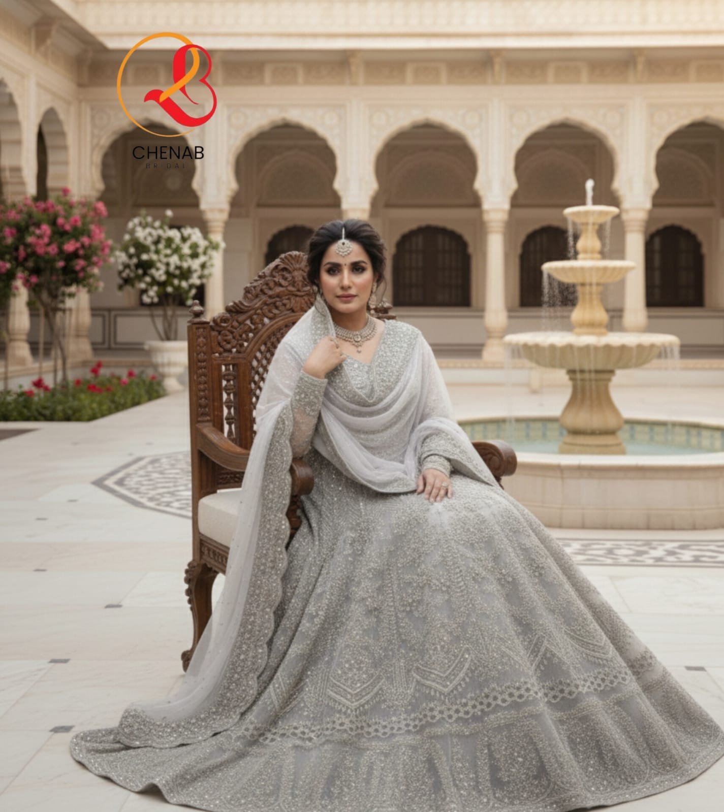 Chenab Bridal Boutique’s silver bridal maxi features fine, delicate handwork all over.