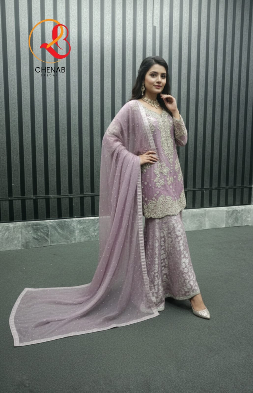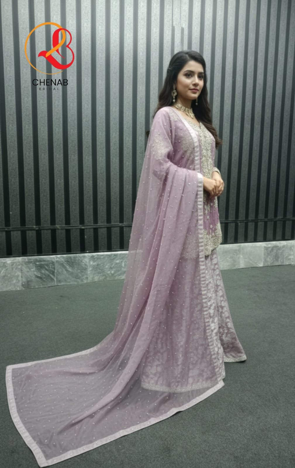 A soft light-purple ensemble featuring a chiffon handworked shirt, a flowy chiffon dupatta, and a beautifully woven jamawar sharara. Perfect for weddings and formal events.