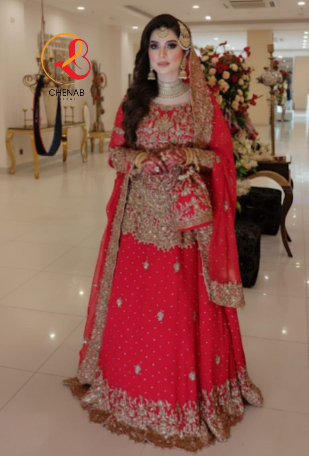 This luxury red wedding outfit features a stunning peplum-style top and a heavy lehenga. The dress has very fine and clean handwork using Nakshi, Badla, and Tila (gold work).