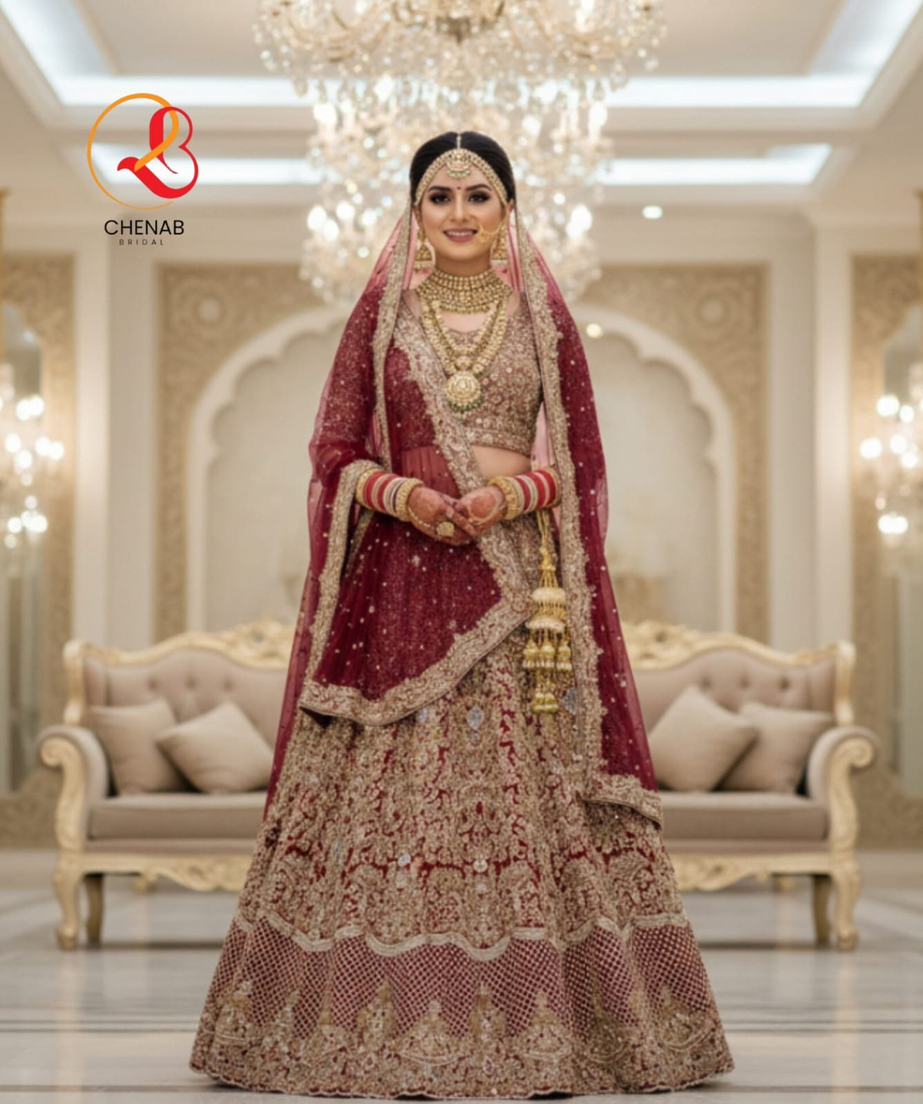 This stunning maroon lehenga choli from Chenab Bridal Boutique is crafted with rich golden embroidery and fine handcrafted detailing.