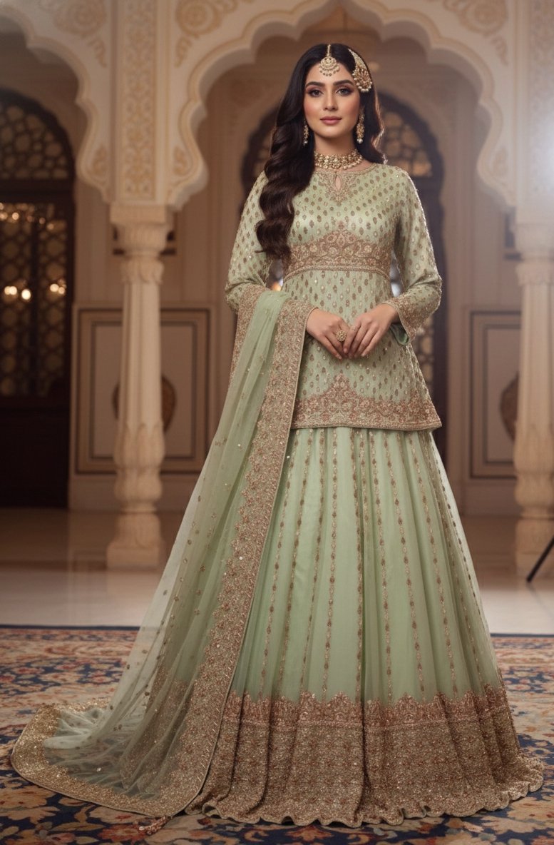 The peplum and lehnga feature intricate all-over handwork that adds elegance and fine detailing.