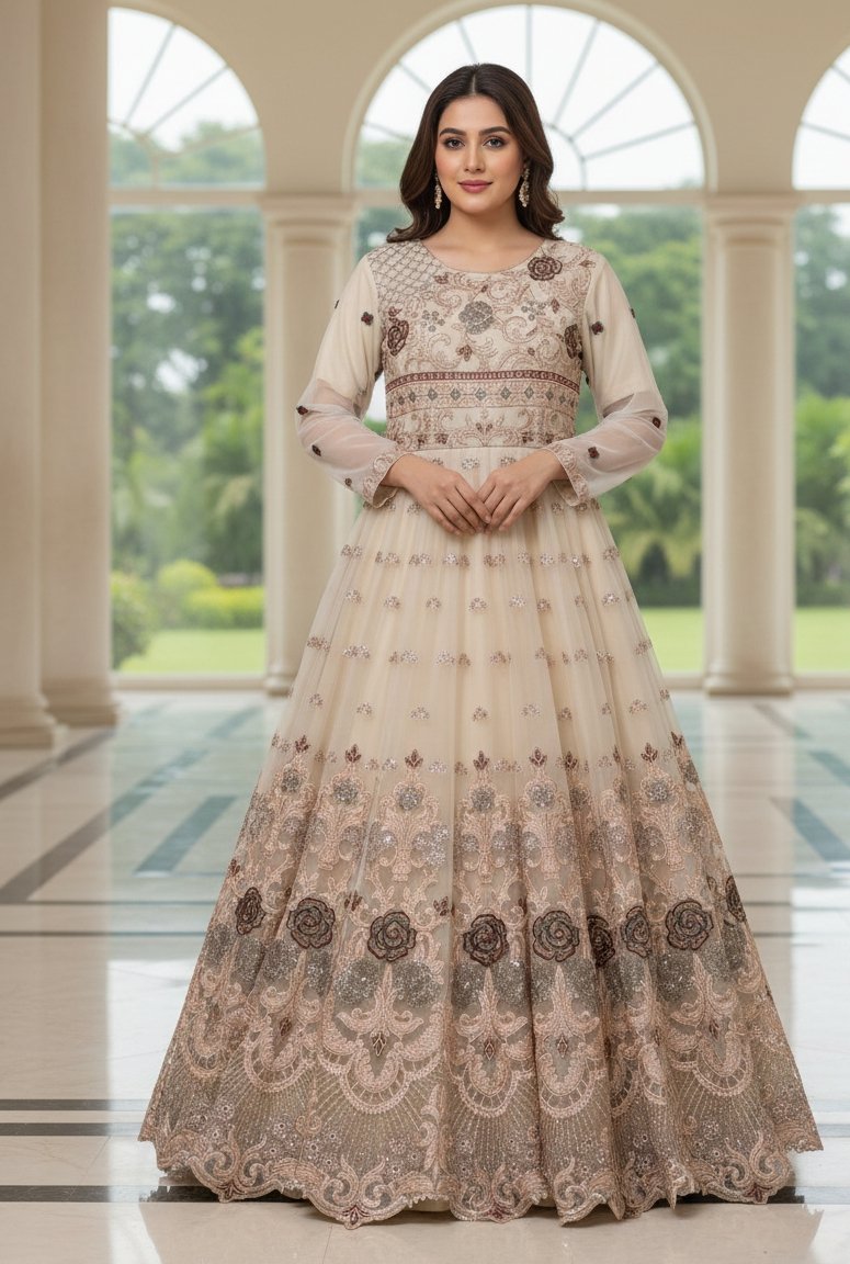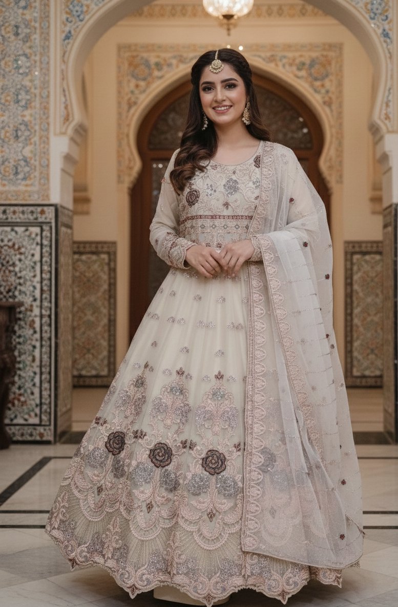 This luxury outfit features a beautifully crafted organza frock adorned with detailed machine embroidery. The intricate work includes fine sequins, resham and tila, giving the dress a rich and elegant look. The embroidery is delicately placed to enhance the overall silhouette of the frock.