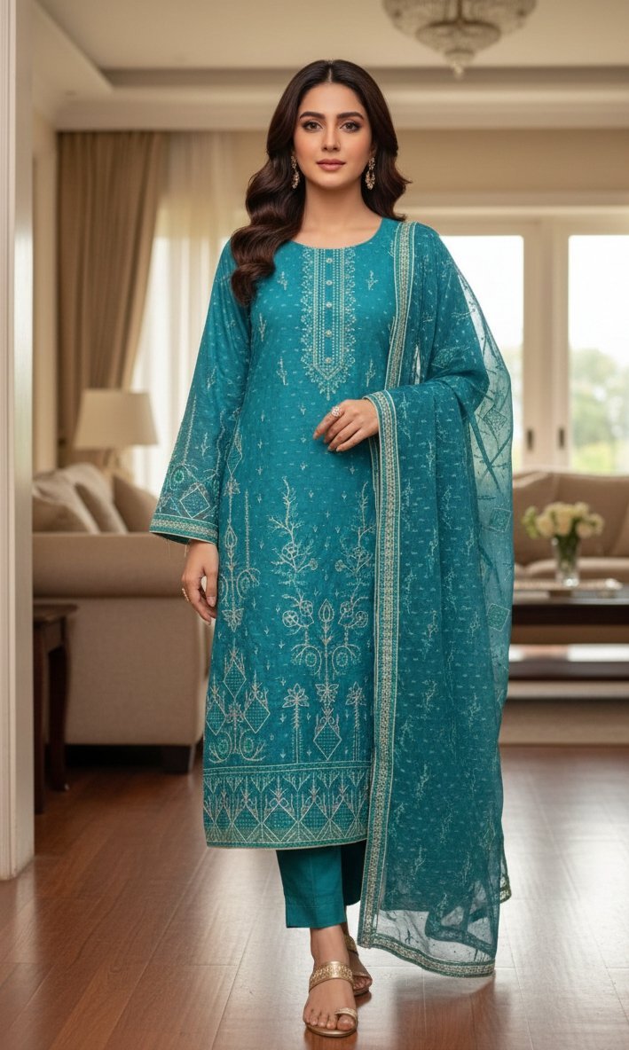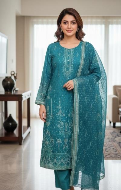 This elegant teal 3-piece suit is crafted from premium organza and beautifully enhanced with delicate machine embroidery and subtle sequin detailing. The embroidered organza dupatta adds a graceful finishing touch, while the comfortable grip trouser ensures a perfect fit. Its refined design and soft shimmer make it an ideal choice for festive gatherings, weddings, and formal occasions.
