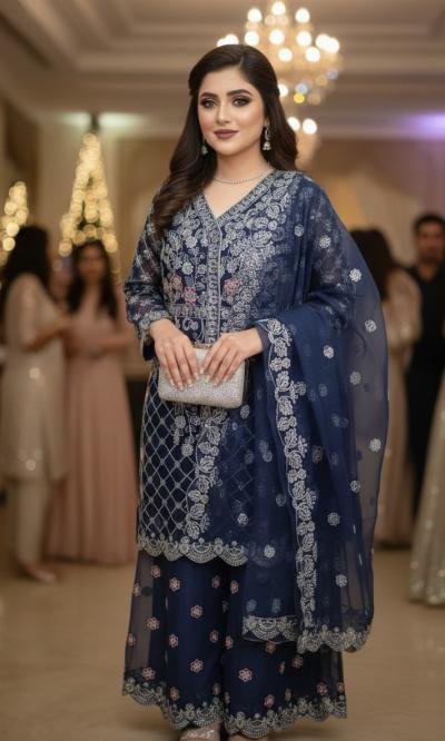 This elegant navy blue chiffon suit is beautifully designed for party and festive wear. The shirt is adorned with fine machine embroidery featuring delicate resham, tila, and sequins work, giving it a graceful and rich look. The chiffon dupatta is lightly embroidered with a detailed border, adding charm to the overall outfit. Paired with a matching chiffon trouser with embroidered , this outfit is perfect for weddings, evening events, and special occasions.