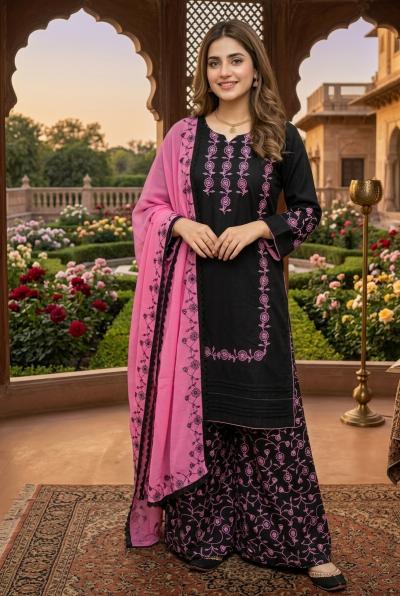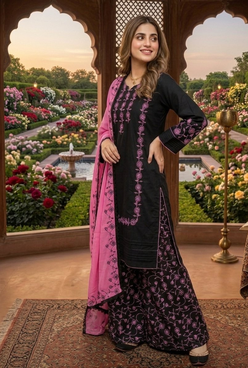 This elegant black cotton suit is beautifully enhanced with intricate pink embroidery, giving it a graceful and eye-catching look. It comes with a matching pink dupatta that adds a soft and stylish contrast to the outfit. Perfect for casual wear and semi-formal occasions, offering both comfort and elegance.