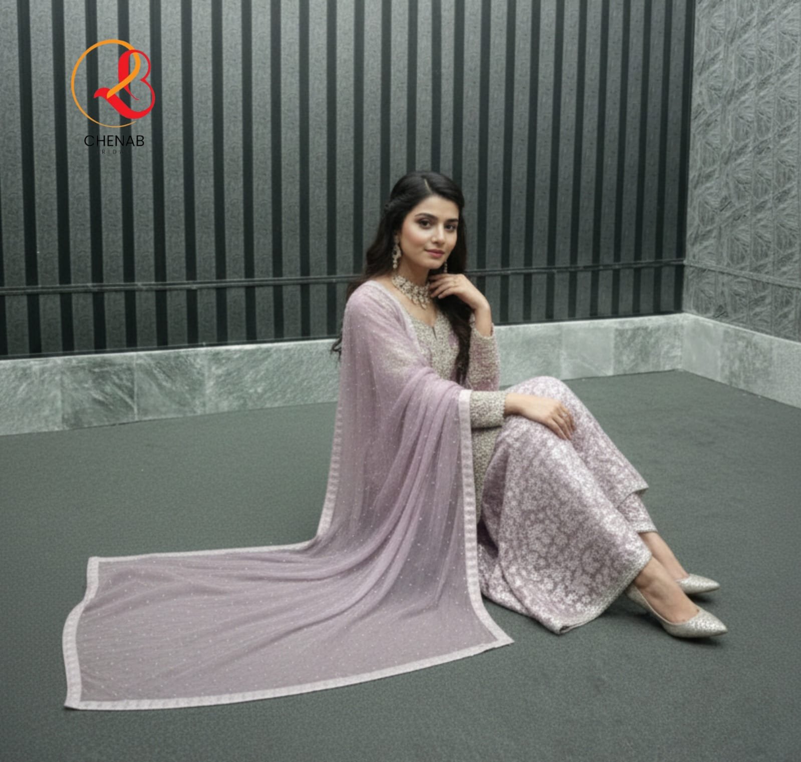 A soft light-purple ensemble featuring a chiffon handworked shirt, a flowy chiffon dupatta, and a beautifully woven jamawar sharara. Perfect for weddings and formal events.