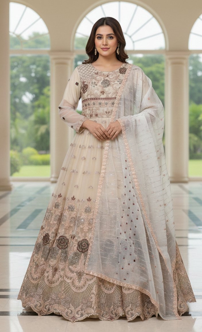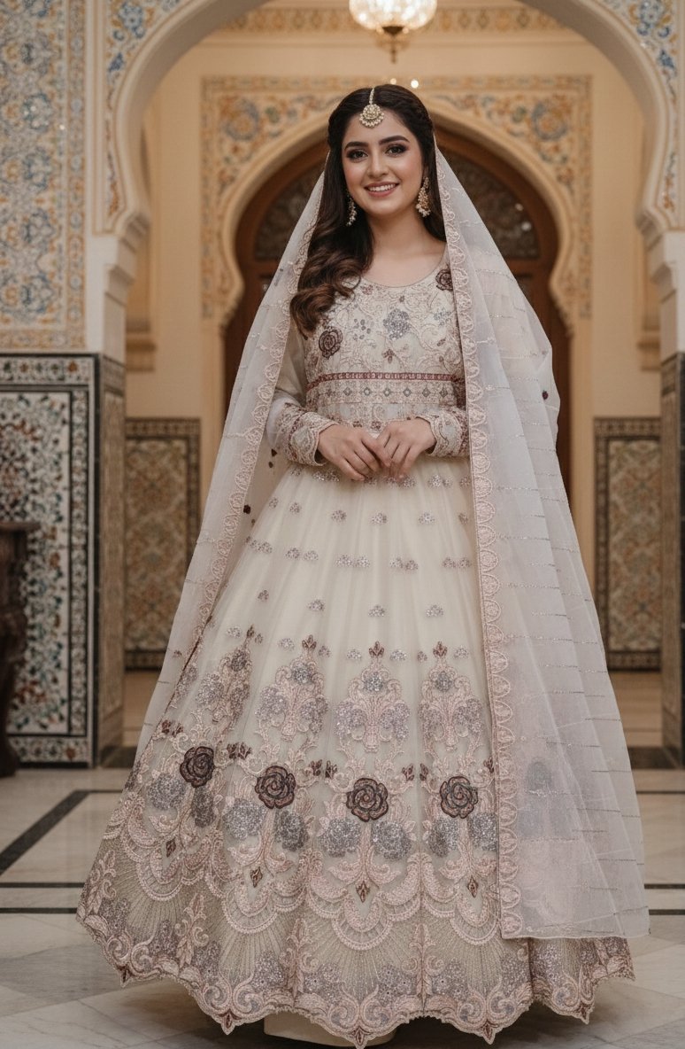 This luxury outfit features a beautifully crafted organza frock adorned with detailed machine embroidery. The intricate work includes fine sequins, resham and tila, giving the dress a rich and elegant look. The embroidery is delicately placed to enhance the overall silhouette of the frock.