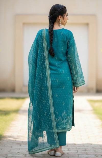 This elegant teal 3-piece suit is crafted from premium organza and beautifully enhanced with delicate machine embroidery and subtle sequin detailing. The embroidered organza dupatta adds a graceful finishing touch, while the comfortable grip trouser ensures a perfect fit. Its refined design and soft shimmer make it an ideal choice for festive gatherings, weddings, and formal occasions.