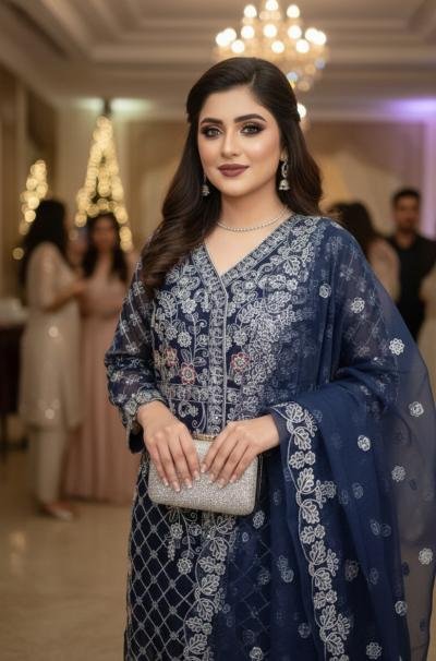 This elegant navy blue chiffon suit is beautifully designed for party and festive wear. The shirt is adorned with fine machine embroidery featuring delicate resham, tila, and sequins work, giving it a graceful and rich look. The chiffon dupatta is lightly embroidered with a detailed border, adding charm to the overall outfit. Paired with a matching chiffon trouser with embroidered , this outfit is perfect for weddings, evening events, and special occasions.